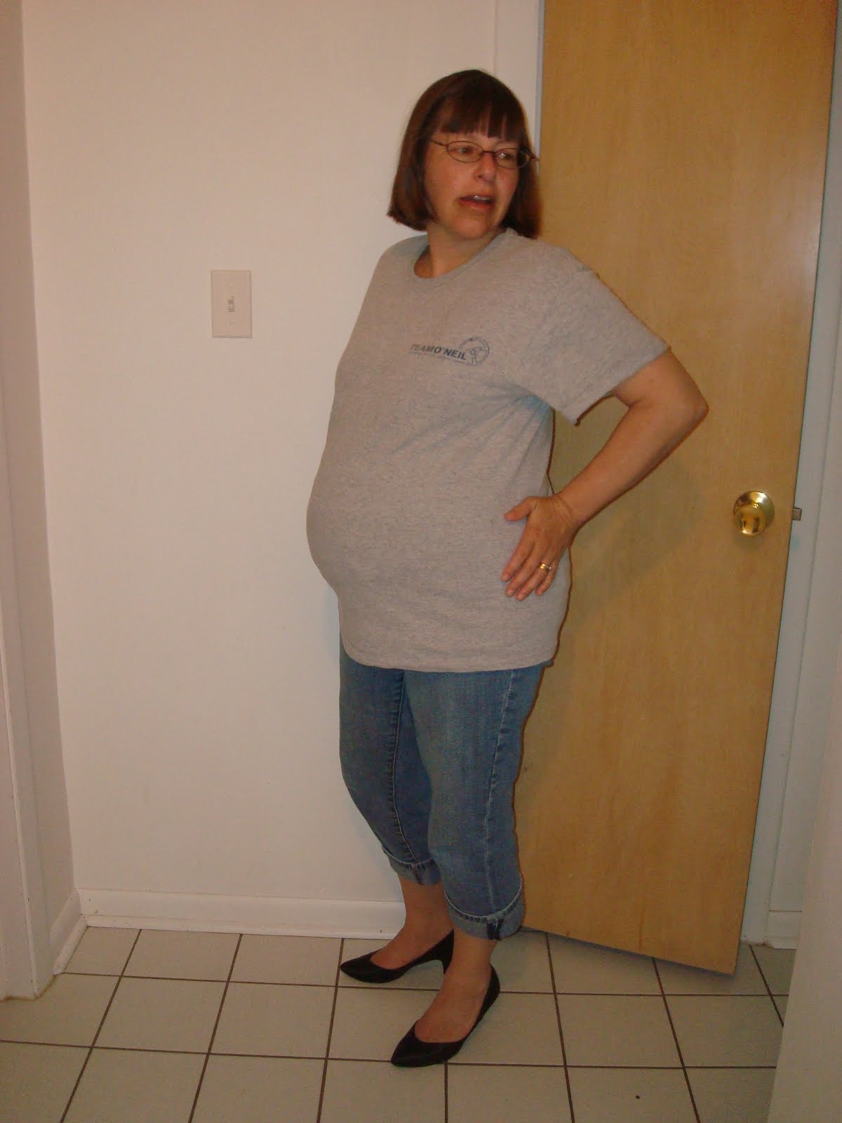 No, I'm not pregnant. I'm simply sporting a belly cast I'd made when I was pregnant with number two.